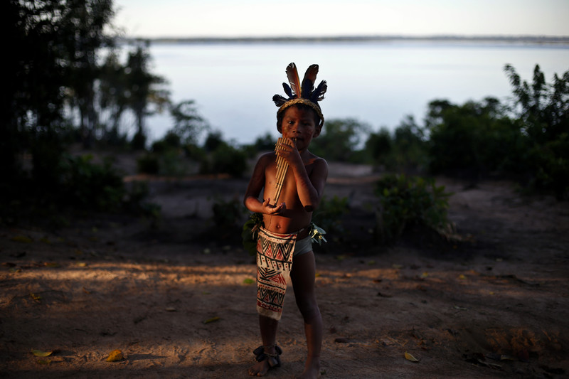 epa04260006 An Indian Tatuyo boy holds a traditional Taricu instrument at Tupe village outskirt of Manaus, Amazon region, Brazil, 15 June 2014. Manaus will host the FIFA World Cup 2014 group A preliminary round match between Cameroon and Croatia on 18 June 2014. EPA/MAST IRHAM