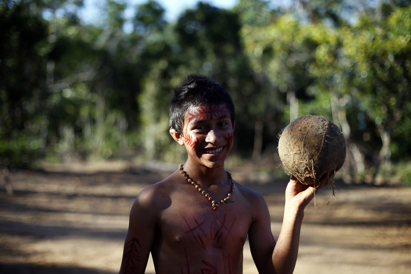 epa04260005 An Indian Tatuyo boy smiles as he hold a coconut at Tupe village outskirt of Manaus, Amazon region, Brazil, 15 June 2014. Manaus will host the FIFA World Cup 2014 group A preliminary round match between Cameroon and Croatia on 18 June 2014. EPA/MAST IRHAM