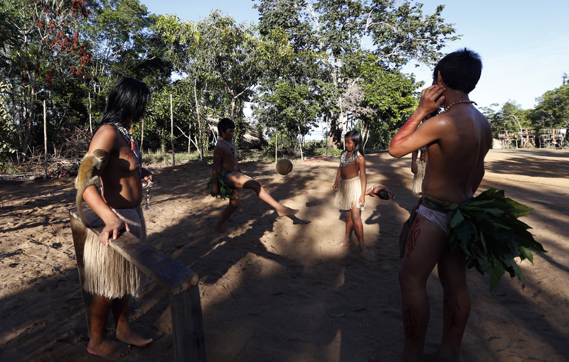 epa04260018 Indian Tatuyo kids play soccer at Tupe village outskirt of Manaus, Amazon region, Brazil, 15 June 2014. Manaus will host the FIFA World Cup 2014 group A preliminary round match between Cameroon and Croatia on 18 June 2014. EPA/MAST IRHAM