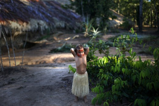 epa04260033 An Indian Tatuyo girl plays at Tupe village outskirt of Manaus, Amazon region, Brazil, 15 June 2014. Manaus will host the FIFA World Cup 2014 group A preliminary round match between Cameroon and Croatia on 18 June 2014. EPA/MAST IRHAM