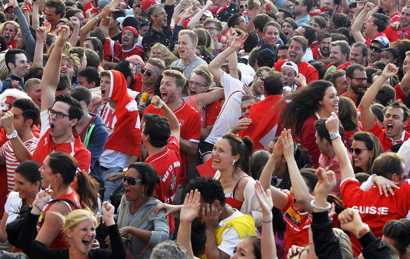 epa04259248 Swiss soccer fans cheer during the live broadcast of the Brazil Soccer FIFA World Cup match between Switzerland and Ecuador at the public viewing WM-Lounge Europaallee in Zurich, Switzerland, 15 June 2014. EPA/WALTER BIERI