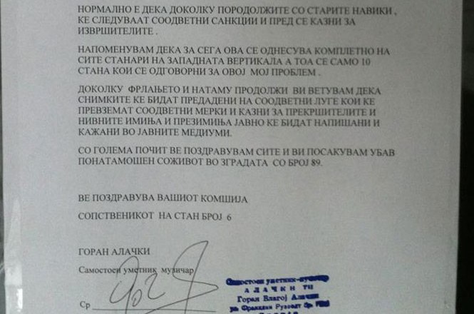 Во пораката која што е доставена до соседите Алачки се заканува дека со професионална видео камера ќе ги сними сите што фрлаат смет и дека снимките ќе ги достави до органите на редот. Повеќе во текстот на off.net.mk
