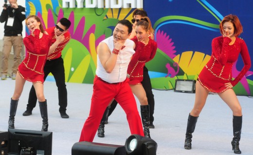 epa04264159 South Korean signer Psy (C) performs in Yeongdong-daero, southern Seoul, South Korea, early 18 June 2014, ahead of a street cheering for the South Korean World Cup squad in its first Group H match against Russia in Brazil. EPA/YANG JI-WOONG