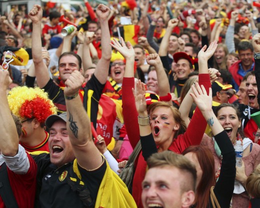 epa04263172 Belgian soccer fans celebrate a goal while watching the Brazil FIFA World Cup 2014 group H preliminary round match between Belgium and Algeria in Namur, Belgium, 17 June 2014. EPA/OLIVIER HOSLET