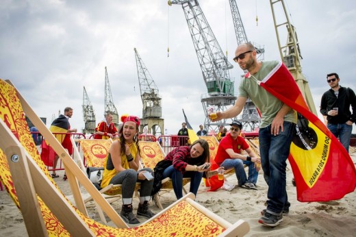 epa04262758 Soccer fans in a public viewing zone in Antwerp, Belgium, 17 June 2014, get ready for the FIFA World Cup 2014 match between Belgium and Algeria played in Belo Horizonte, Brazil, later today. EPA/MARCO DE SWART