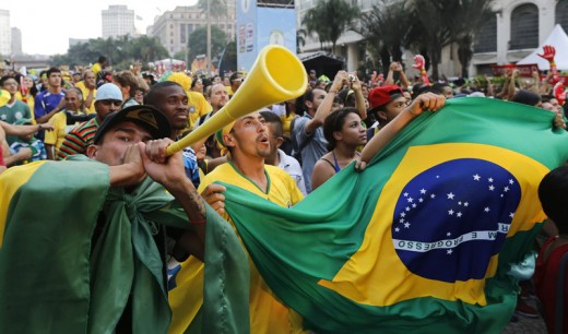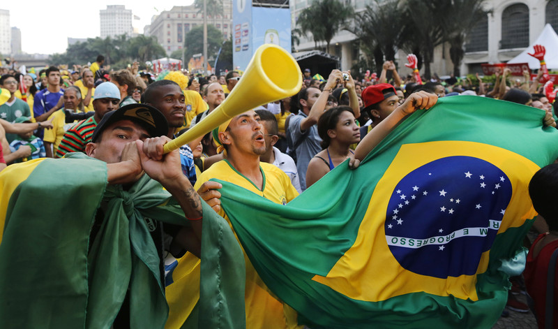 epa04264042 Brazilian fans cheer for their team before watching the FIFA World Cup 2014 group A preliminary round match between Brazil and Mexico at the FIFA Fan Fest in Sao Paulo, Brazil, 17 June 2014. The match at the Estadio Castelao in Fortaleza ended 0-0. EPA/TOLGA BOZOGLU