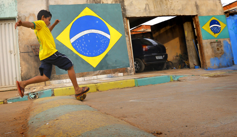epa04264086 A Brazilian boy plays soccer on a street in the Vila Estrutural shanty town, 15km from Brasilia, Brazil, 17 June 2014, before the FIFA World Cup 2014 group A preliminary round match between Brazil and Mexico. The match at the Estadio Castelao in Fortaleza ended 0-0. EPA/ROBERT GHEMENT