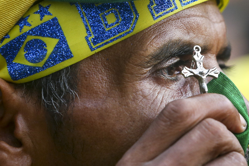 epa04264106 A Brazilian supporter holds a cross while watching the FIFA World Cup 2014 group A preliminary round match between Brazil and Mexico at the FIFA Fan Fest in Sao Paulo, Brazil, 17 June 2014. The match at the Estadio Castelao in Fortaleza ended 0-0. EPA/DIEGO AZUBEL