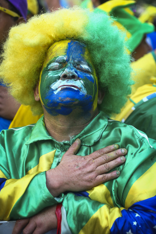 epa04264105 A Brazilian fan before the start of the FIFA World Cup 2014 group A preliminary round match between Brazil and Mexico at the FIFA Fan Fest in Sao Paulo, Brazil, 17 June 2014. The match at the Estadio Castelao in Fortaleza ended 0-0. EPA/DIEGO AZUBEL