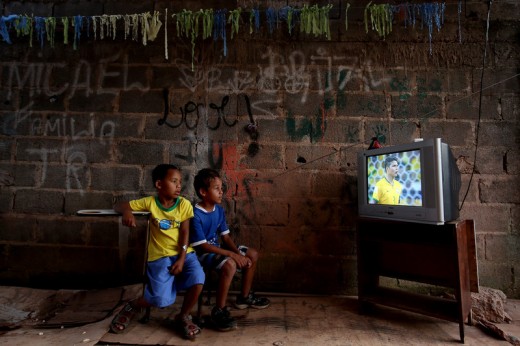epaselect epa04264007 Two Brazilian boys watch the FIFA World Cup 2014 group A preliminary round match between Brazil and Mexico at their home in the Varjao shanty town in Brasilia, Brazil, 17 June 2014. The match at the Estadio Castelao in Fortaleza ended 0-0. EPA/FERNANDO BIZERRA JR.