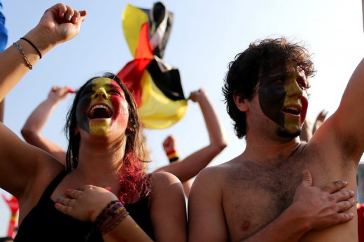 epa04263341 Supporters of Belgium celebrate after the soccer match between Belgium and Algeria as part of FIFA World Cup 2014 in the FIFA Fan Fest zone at the Copacabana beach in Rio de Janeiro, Brazil, 17 June 2014. Belgium defeated 2-1 Algeria. EPA/ANTONIO LACERDA