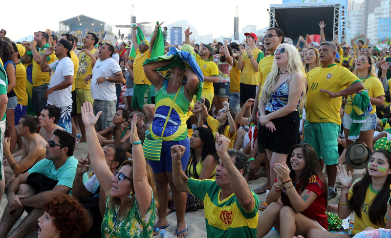epa04263892 Brazilian fans react while watching the FIFA World Cup 2014 group A preliminary round match between Brazil and Mexico at the FIFA Fan Fest at the Copacabana in Rio de Janeiro, Brazil, 17 June 2014. EPA/ABEDIN TAHERKENAREH