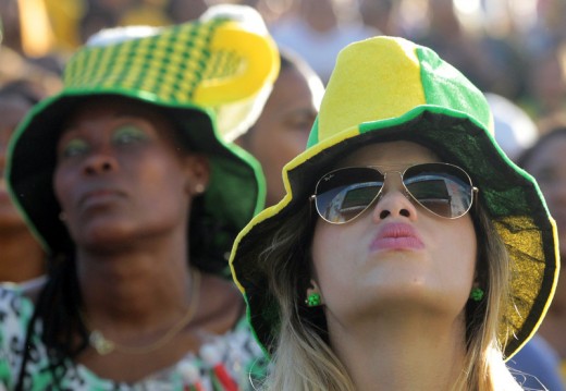 epa04263915 Brazilian fans react while watching the FIFA World Cup 2014 group A preliminary round match between Brazil and Mexico at the FIFA Fan Fest in Salvador, Brazil, 17 June 2014. The match at the Estadio Castelao in Fortaleza ended 0-0. EPA/GUILLAUME HORCAJUELO