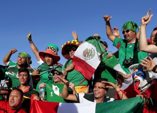 epa04263920 Mexican supporters cheer for their team before watching the FIFA World Cup 2014 group A preliminary round match between Brazil and Mexico at the FIFA Fan Fest in Salvador, Brazil, 17 June 2014. The match at the Estadio Castelao in Fortaleza ended 0-0. EPA/GUILLAUME HORCAJUELO