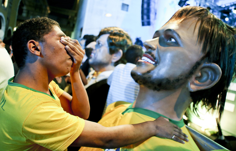 epa04263932 A supporter of Brazil reacts while watching the FIFA World Cup 2014 Group A match between Brazil and Mexico in the FIFA Fan Fest zone Recife, Brazil, 17 June 2014. At the right are the so-called Bonecos Gigantes, giant dolls that can be seen during the carnival and other festivities in Brazil. EPA/SRDJAN SUKI