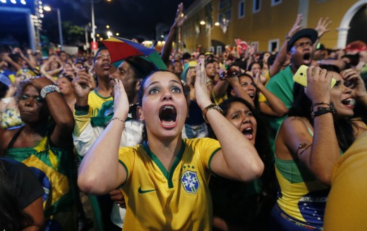 epa04263952 Supporters of Brazil react while watching the FIFA World Cup 2014 Group A match between Brazil and Mexico in the FIFA Fan Fest zone in Recife, Brazil, 17 June 2014. EPA/YURI KOCHETKOV