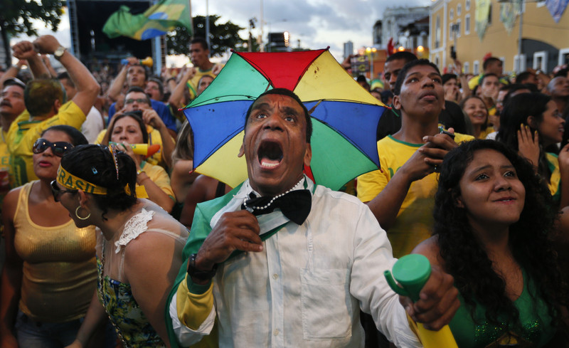 epa04263956 Supporters of Brazil watching the FIFA World Cup 2014 Group A match between Brazil and Mexico in the FIFA Fan Fest zone in Recife, Brazil, 17 June 2014. EPA/YURI KOCHETKOV
