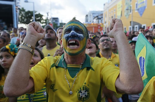 epa04263950 Supporters of Brazil react while watching the FIFA World Cup 2014 Group A match between Brazil and Mexico in the FIFA Fan Fest zone in Recife, Brazil, 17 June 2014. EPA/YURI KOCHETKOV