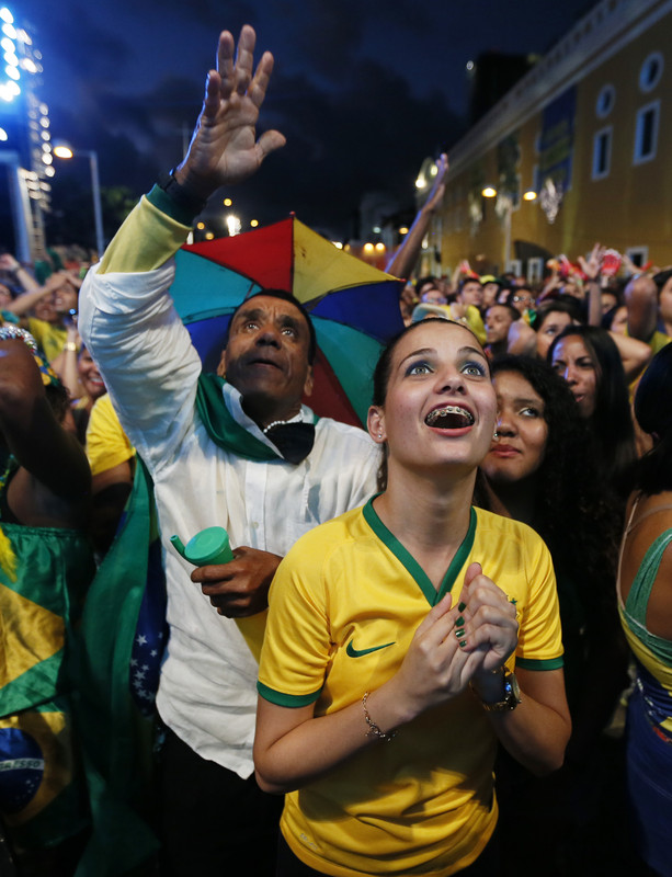 epa04263959 Supporters of Brazil watching the FIFA World Cup 2014 Group A match between Brazil and Mexico in the FIFA Fan Fest zone in Recife, Brazil, 17 June 2014. EPA/YURI KOCHETKOV