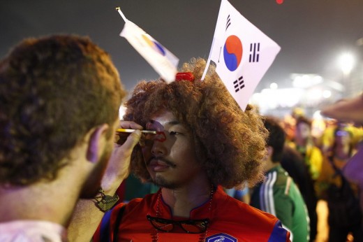 epa04263979 A South Korea supporter get his face painted at the FIFA Fan Fest on the Copacabana before watching the FIFA World Cup 2014 Group H match between South Korea and Russia, Rio de Janeiro, Brazil, 17 June 2014. EPA/Antonio Lacerda