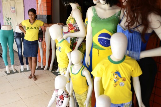 epa04263981 A shop keeper selling Brazilian national soccer team clothes poses in front of her store before the FIFA World Cup 2014 group A preliminary round match between Brazil and Mexico in Estructura, Brazil, 17 June 2014. The match at the Estadio Castelao in Fortaleza ended 0-0. EPA/SHAWN THEW