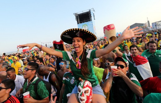 epa04263992 Mexican fans watching the FIFA World Cup 2014 group A preliminary round match between Brazil and Mexico at the FIFA Fan Fest at the Copacabana in Rio de Janeiro, Brazil, 17 June 2014. Brazil and Mexico drew 0-0. EPA/ABEDIN TAHERKENAREH