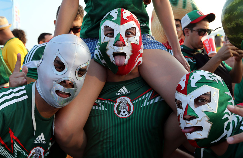 epa04264004 Mexican fans pose while watching the FIFA World Cup 2014 group A preliminary round match between Brazil and Mexico at the FIFA Fan Fest at the Copacabana in Rio de Janeiro, Brazil, 17 June 2014. Brazil and Mexico drew 0-0. EPA/ABEDIN TAHERKENAREH