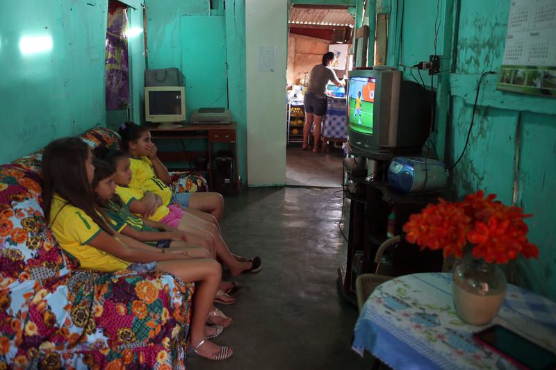 epa04264008 Brazilian fans watch the FIFA World Cup 2014 group A preliminary round match between Brazil and Mexico at their home in the Varjao shanty town in Brasilia, Brazil, 17 June 2014. The match at the Estadio Castelao in Fortaleza ended 0-0. EPA/FERNANDO BIZERRA JR.