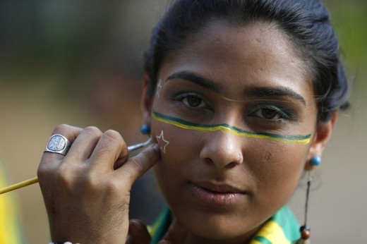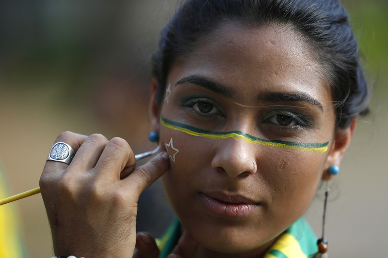 epa04264016 A Brazilian fan gets her face painted before the FIFA World Cup 2014 group A preliminary round match between Brazil and Mexico at the FIFA Fan Fest in Sao Paulo, Brazil, 17 June 2014. The match at the Estadio Castelao in Fortaleza ended 0-0. EPA/TOLGA BOZOGLU