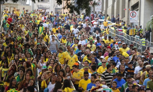 epa04264033 Brazilian fans line up to enter the FIFA Fan Fest to watch the FIFA World Cup 2014 group A preliminary round match between Brazil and Mexico in Sao Paulo, Brazil, 17 June 2014. The match at the Estadio Castelao in Fortaleza ended 0-0. EPA/TOLGA BOZOGLU