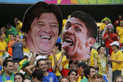 epa04263388 Soccer fans prior the FIFA World Cup 2014 group A preliminary round match between Brazil and Mexico at the Estadio Castelao in Fortaleza, Brazil, 17 June 2014. Left placard is Mexico coach Miguel Herrera.