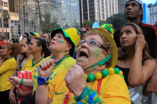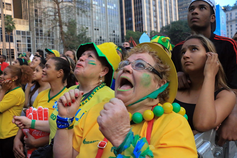 epa04263757 Brazilian supporters support their team during a public broadcast of FIFA World Cup 2014 group A preliminary round match between Brazil and Mexico at the FIFA FAN FEST in Sao Paulo, Brazil, 17 June 2014. EPA/CARLOS VILLALBA RACINES