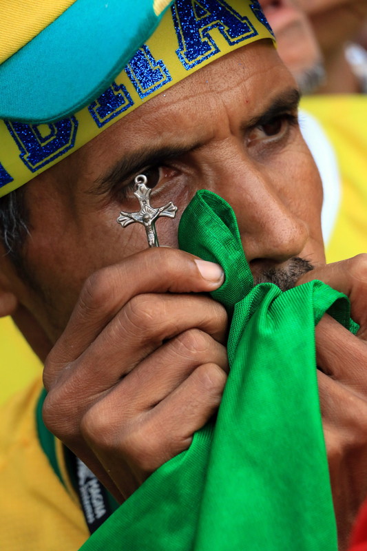 epa04263762 A Brazilian supporter supports the team during a public broadcast of FIFA World Cup 2014 group A preliminary round match between Brazil and Mexico at the FIFA FAN FEST in Sao Paulo, Brazil, 17 June 2014. EPA/CARLOS VILLALBA RACINES