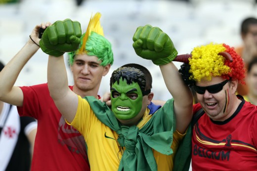 epa04262742 Belgium supporters cheer with a man dressed-up as Bazilian player and comic character Hulk (C) prior the FIFA World Cup 2014 group H preliminary round match between Belgium and Algeria at the Estadio Mineirao in Belo Horizonte, Brazil, 17 June 2014.
