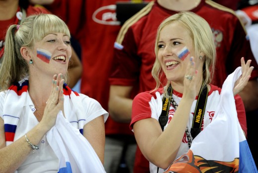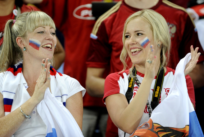 epa04263946 Supporters of Russia cheer during the FIFA World Cup 2014 group H preliminary round match between Russia and South Korea at the Arena Pantanal in Cuiaba, Brazil, 17 June 2014.