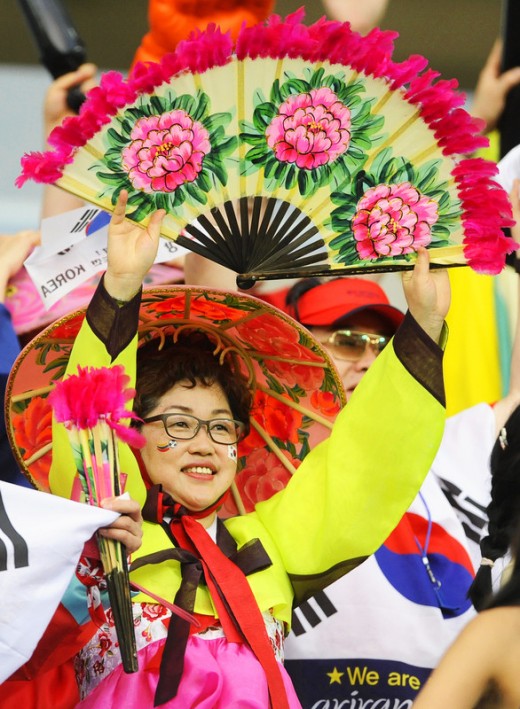 epa04263865 A South Korean fan cheers for her team before the FIFA World Cup 2014 group H preliminary round match between Russia and South Korea at the Arena Pantanal in Cuiaba, Brazil, 17 June 2014.