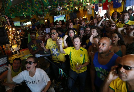 epa04263935 Soccer fans watch Brazil play Mexico in FIFA World Cup 2014 at Miss Favela bar in the Williamsburg section of Brooklyn , New York, USA, 17 June 2014. EPA/Andrew Gombert