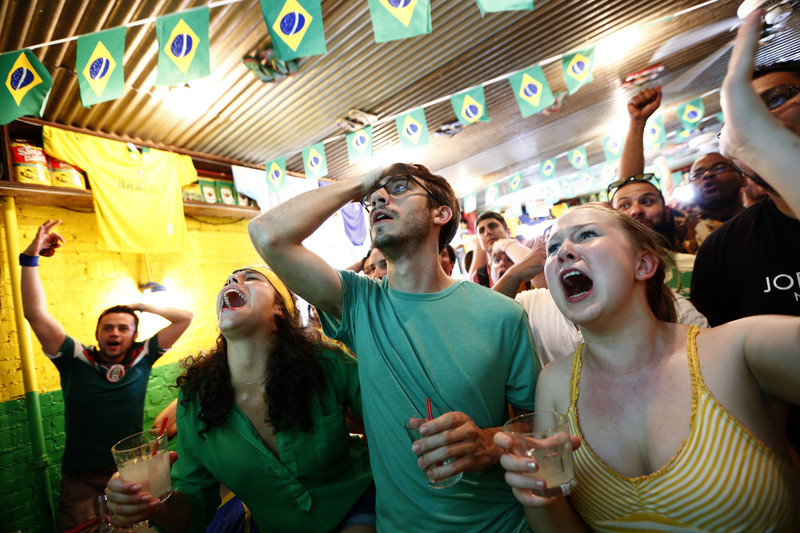 epa04263975 Soccer fans watch Brazil play Mexico in FIFA World Cup 2014 at Miss Favela bar in the Williamsburg section of Brooklyn , New York, USA, 17 June 2014. EPA/Andrew Gombert