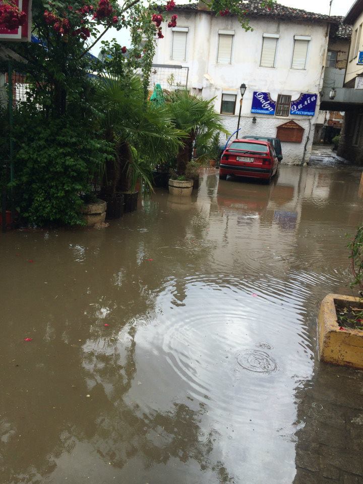 Попладнево Охрид го зафати силно невреме со дожд и град. Улиците покрај езерото се полни со вода која шахтите тешко ја собираат. Кафулињата крај езерото објавија фотографии од поплавените улици.
