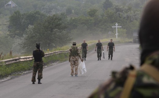 epa04266318 A photo made available 19 June 2014 of a pro-Russian militant walking with a white flag near the village of Karlivka, near Donetsk, Ukraine, 18 June 2014 during the handover of bodies of Ukrainian soldiers who died in a downed Ukrainian military transport plane (IL-76) near Luhansk. The Ukrainian prosecutor’s office had confirmed that 49 people were killed after separatists shot down an Ilyushin-76 transport plane of the Ukraine Air Force as it was approaching an airport in Luhansk. EPA/STRINGER