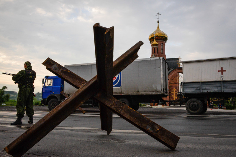epa04266321 A photo made available 19 June 2014 of a truck marked with a Red Cross and beleived to transports the bodies of Ukrainian soldiers who died in a downed Ukrainian military transport plane (IL-76) near Lugansk, passing a checkpoint in the village of Karlivka near Donetsk, Ukraine, 18 June 2014. The Ukrainian prosecutor’s office had confirmed that 49 people were killed after separatists shot down an Ilyushin-76 transport plane of the Ukraine Air Force as it was approaching an airport in Luhansk. EPA/STRINGER