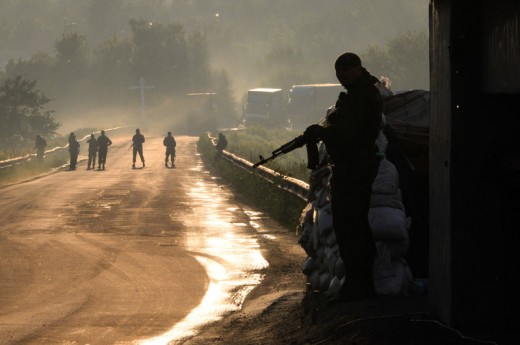 epa04266324 A photo made available 19 June 2014 of pro-Russian militants guarding on a street near the village of Karlivka, near Donetsk, Ukraine, where the handover of bodies of Ukrainian soldiers who died in a downed Ukrainian military transport plane (IL-76) near Luhansk was arranged on 18 June 2014. The Ukrainian prosecutor’s office had confirmed that 49 people were killed after separatists shot down an Ilyushin-76 transport plane of the Ukraine Air Force as it was approaching an airport in Luhansk. EPA/STRINGER