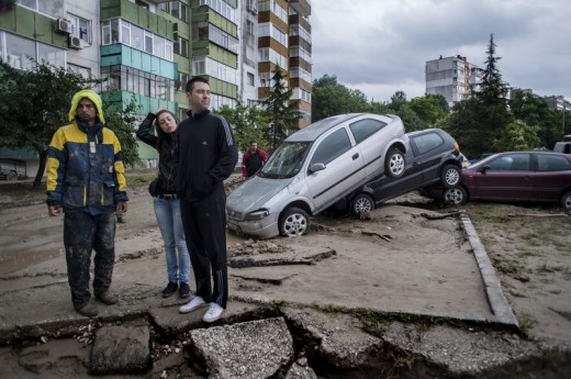 epa04268629 People observe the damage after heavy rains hit the Black Sea city of Varna in the neighborhood of Asparuhovo, Varna, Bulgaria, 20 June 2014. At least 11 people, two of them children, have died after torrential rains caused flooding in eastern Bulgaria, the Interior Minstry said. Ten of the victims were found in the Black Sea port of Varna and another in Dobrich, 35 kilometres to the north. Several people were still missing. Lower sections of Varna were completely submerged. The floodwaters swept cars away and the work of rescue teams was hampered because of the drifting vehicles. EPA/STR
