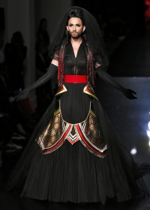 epa04307482 Austrian singer and Eurovision winner Conchita Wurst presents a creation from the Haute Couture Fall-Winter 2014/15 collection by French designer Jean-Paul Gaultier during the Paris Fashion Week, in Paris, France, 09 July 2014. The presentation of the Women’s Haute Couture collections runs from 06 to 10 July. EPA/IAN LANGSDON