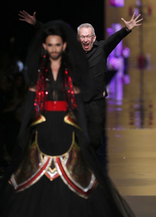 epa04307477 French designer Jean-Paul Gaultier (R) takes to the catwalk as Austrian singer and Eurovision winner Conchita Wurst (L) presents a creation from his Haute Couture Fall-Winter 2014/15 collection during the Paris Fashion Week, in Paris, France, 09 July 2014. The presentation of the Women’s Haute Couture collections runs from 06 to 10 July. EPA/IAN LANGSDON