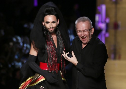 epaselect epa04307469 Austrian singer and Eurovision winner Conchita Wurst (L) presents a creation from the Haute Couture Fall-Winter 2014/15 collection by French designer Jean-Paul Gaultier (R) during the Paris Fashion Week, in Paris, France, 09 July 2014. The presentation of the Women’s Haute Couture collections runs from 06 to 10 July. EPA/IAN LANGSDON