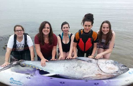Петте девојки ја забележале џиновската риба како мртва плута по морето. Успеале да ја префрлат на својот кајак и одвеслале до брегот.
