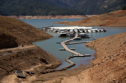 epa04329687 Houseboats and boat docks on Digger Bay Marina in Shasta Lake City, California, USA, 24 July 2014. Water levels show below the reddish banks of Shasta Lake which is 41 meters (135 ft) from crest and 36 per cent of capacity as California goes through its third straight year of dry weather. California Governor Edmund G. Brown Jr., has declared a drought state of emergency and asking consumers to conserve 20 per cent of water. Mandatory conservations is now in effect in some counties. EPA/JOHN G. MABANGLO