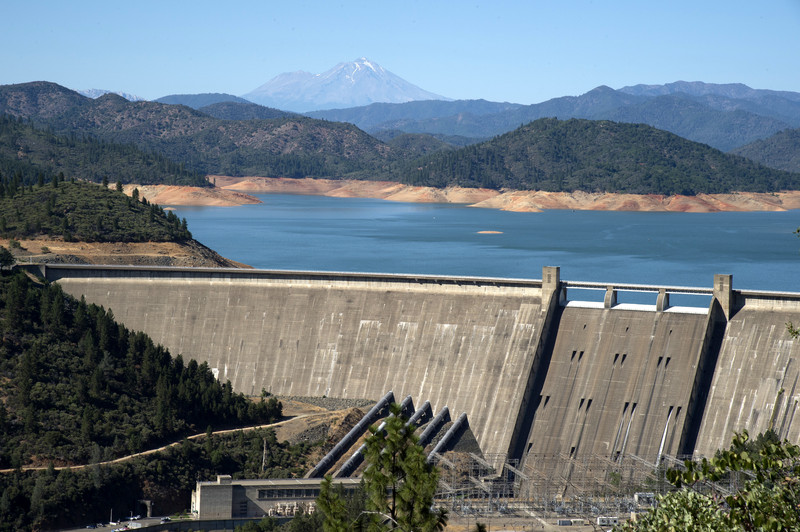 epa04329686 Shasta Dam, the largest Dam in California and the second largest in the United States as shown with Shasta Lake and Mt. Shasta in the background in Shasta Lake City, California, USA, 24 July 2014. Water levels show below the reddish banks of Shasta Lake which is 41 meters (135 ft) from crest and 36 per cent of capacity as California goes through its third straight year of dry weather. California Governor Edmund G. Brown Jr., has declared a drought state of emergency and asking consumers to conserve 20 per cent of water. Mandatory conservations is now in effect in some counties. EPA/JOHN G. MABANGLO
