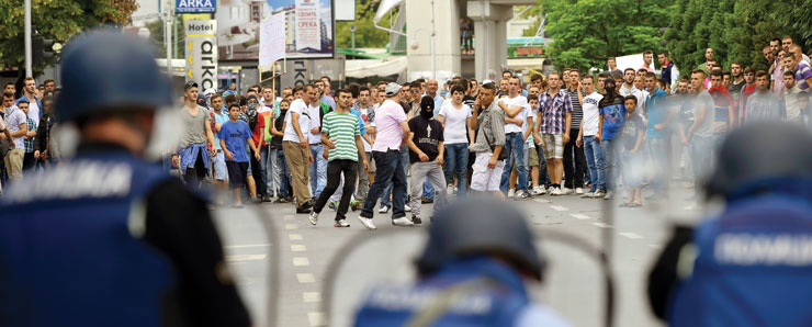 Стотината метри напуштени коловозни ленти ги исполнуваа извици против полицијата, судот, државата, восклици за големината на Алах, на УЧК. Со иста силина ‘ржеше и полициската механизација. Полицијата го зазеде „својот дел“ од улицата гледајќи кон толпата преку оградата од полициски штитови.